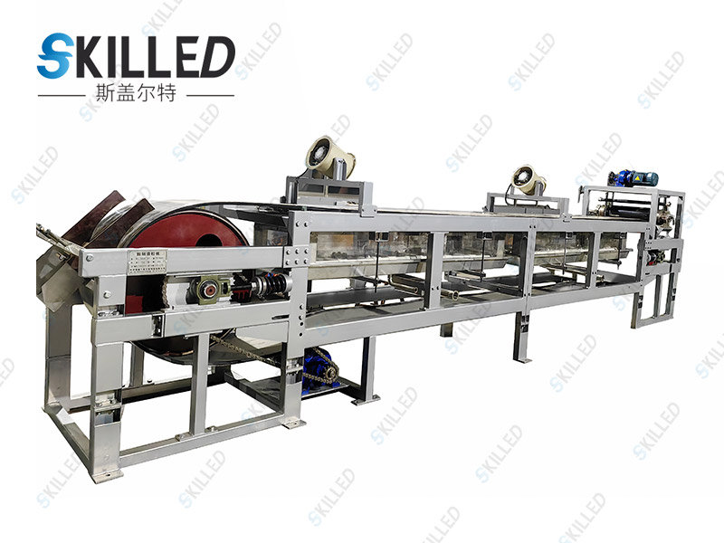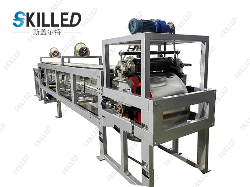 该机主要由落料模造粒成型机头,冷却输送不锈钢带及带轮、喷淋冷却系统、传动系统、保温装置、机架、刮刀等组成。落料模造粒机头主要由机头模套和机头芯轴等组成。喷淋冷却系统主要由喷头、盛水池等组成。传动系统主要由减速箱(减速器)调速电机等组成。