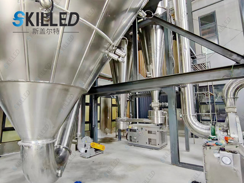 5、造粒塔内壁、出粉管道、旋风分离器材质选用SUS304/BA镜面不锈钢板材,焊缝处理全部采用氩气保护焊接,焊缝磨平抛光,抛光精度达到0.3μ,有效防止管路“积粉积料”现象。出粉管路及旋风分离器设有快开式清洗口,便于拆装、清洗、消毒和杀菌,完全符合食品卫生要求。