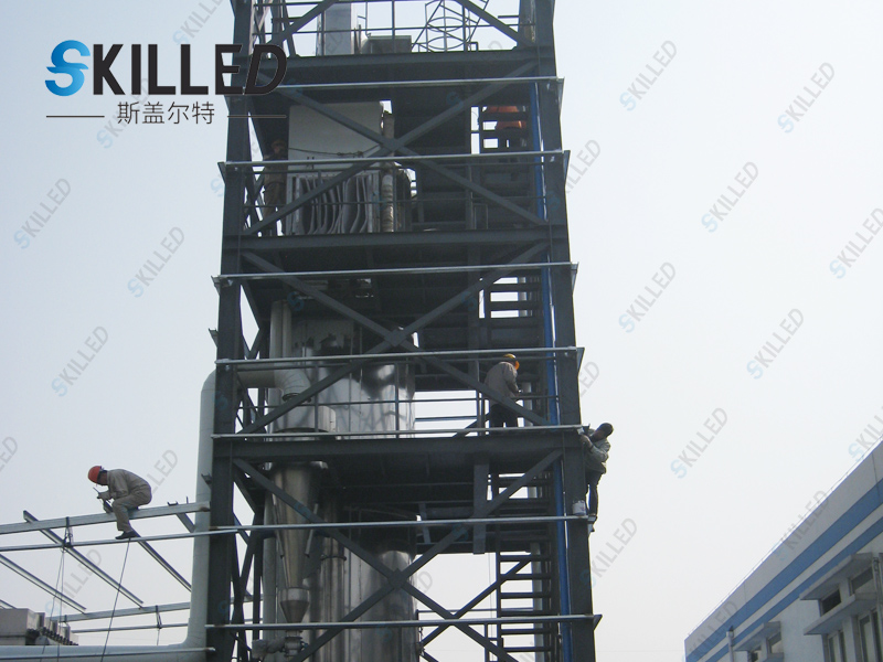 工作原理料液通过隔膜泵高压输入,喷出雾状液滴,然后同热空气并流下降,大部分粉粒由塔底排料口收集,废气及其微小粉末经旋风分离器分离,废气由抽风机排出,粉末由设在旋风分离器下端的授粉筒收集,风机出口还可装备二级除尘装置,回收率在96-98%以上。