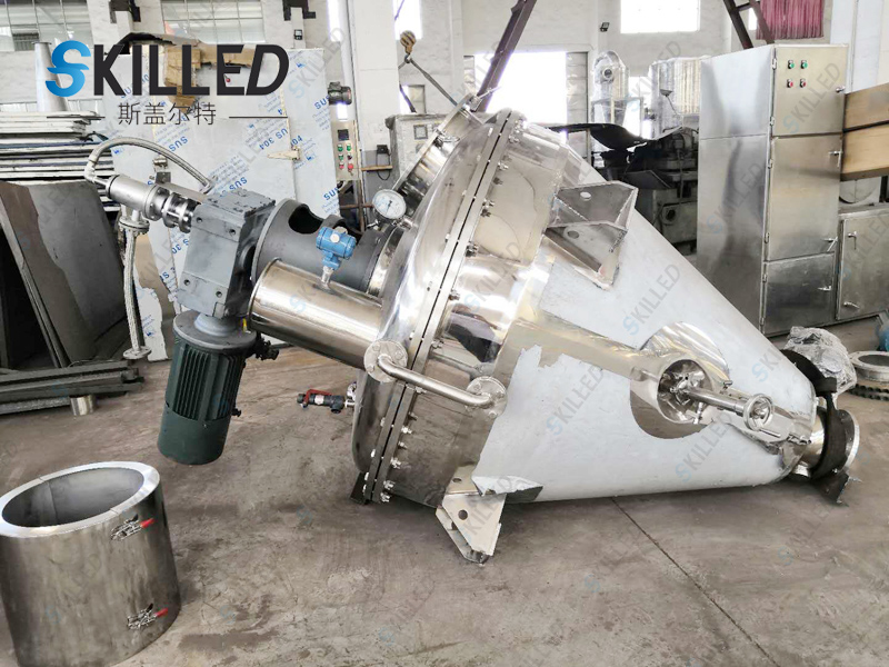工作原理本机由加热锥体设有加热夹套,热源为热水、导热油或低压蒸汽,从而使锥体内壁保持一定的的温度。变频调速电机经平行斜齿轮减速机,驱动单螺带搅拌器旋转,带动物料沿锥型筒旋转并自下而上提升,物料到达高点后由重力和惯性作用,自动流向旋涡中心回到锥型筒体底部,整个过程使物料在锥型筒体内强制加热,相对对流、掺混,热量在物料中相互扩散,使物料作全方位的不规则往复运动,完成物料同单螺带和筒壁表面进行高频率传热交换,在短时间内达到加热干燥的效果。从而使物料内部水份不断蒸发,在真空泵的作用下,水蒸汽由真空泵引出,如须回收液体可加冷凝器、回收液储罐回收。干燥完成后,打开下部的出料阀出料。