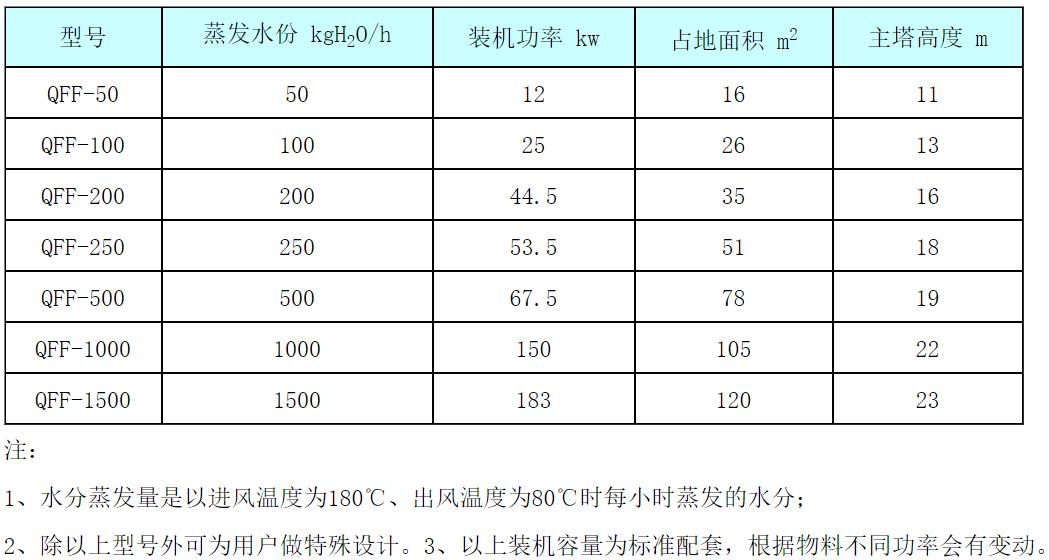 1、水分蒸发量是以进风温度为180℃、出风温度为80℃时每小时蒸发的水分;