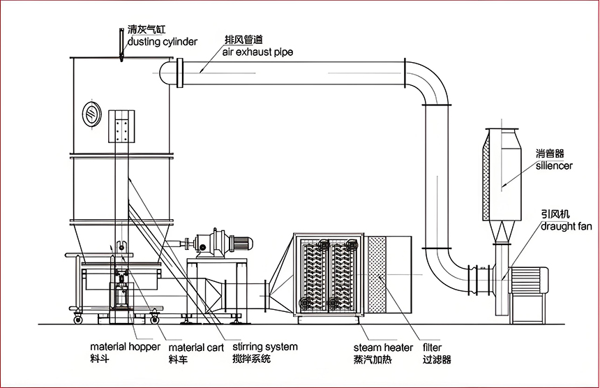 产品应用本机主要适用于医药、食品、化工等行业进行粉末或颗粒物料的干燥。