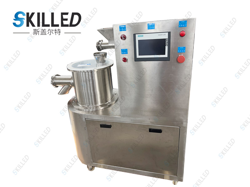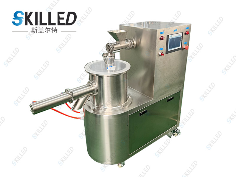 本机是通过设置旋转离心盘、鼓风机、气动喷枪,将湿颗粒制成美丽的球丸。将前道工序做成的湿颗粒投入旋转离心盘内,启动鼓风机后再将旋转离心盘启动,使湿颗粒受到环隙空气浮力、旋转离心力、自身重力作用,呈环周绳股状运动从而形成真球度高的球丸。旋转盘自动升降,使物料的收集和制丸速度大大提高。