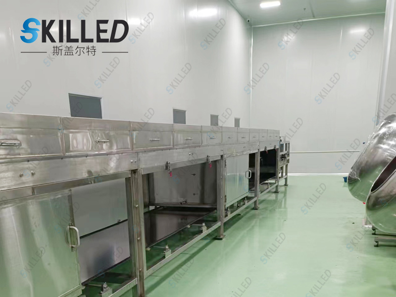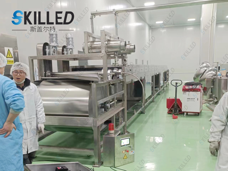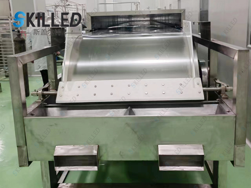 产品概述 巧克力造粒机是利用物料的熔点低于250℃的特性,根据物料熔融态时的粘度范围,通过特殊的布料装置将熔融液均匀在其下方匀速移动的钢带上,在钢带下方设置的连续喷淋装置的冷却作用下,使物料在输送、移运过程中得到冷却、固化、包装,从而达到造粒成型的目的。