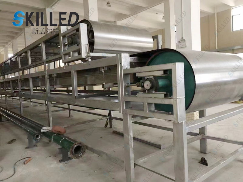 适用范围SKJP系列双层钢带结片机适用于高温度,高熔点,高粘度物料,典型应用树脂类的快速冷却固化,追求高产量,每小时最高可生产10吨。